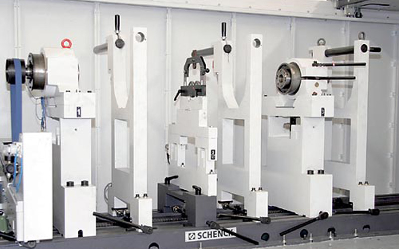 The machine consists basically of: machine base, support pedestals with spindle bearings and vibration sensors, belt-drive with drive motor, control cabinet with measuring unit and drive controls, safety brackets and protective enclosure of the class C according to ISO 7475.
